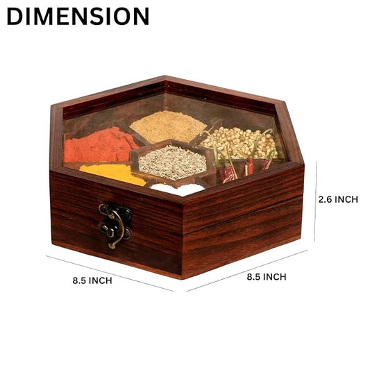 Elegant Sheesham Hexagonal Spice Box with Glass Lid & Spoon