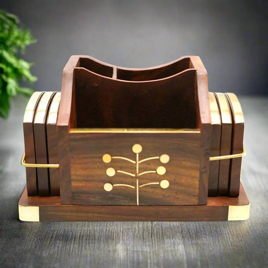 Multipurpose Wooden Cutlery Stand & Coaster Set - 6 inch x 4 inch x 3.3 inch