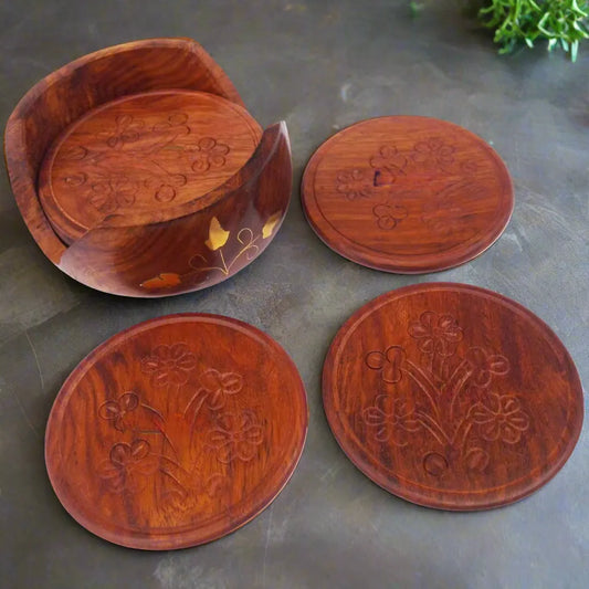 Sheesham Wood Coaster Set with Brass Flower - 4 inch x 4 inch x 2 inch